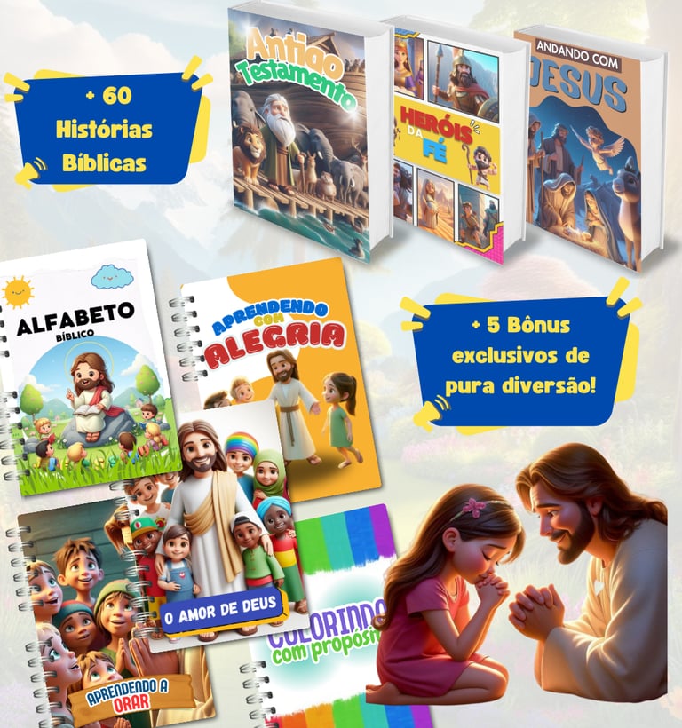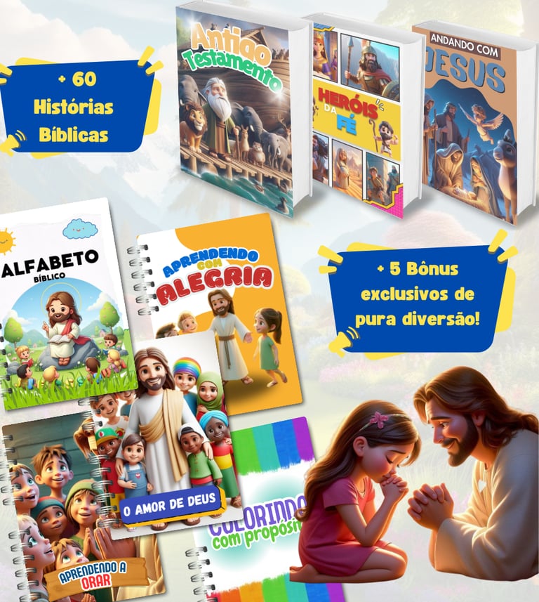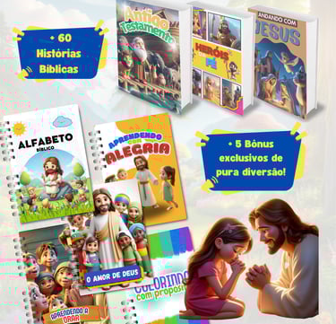 Kit completo com + 60 histórias bíblicas que vão fazer seu filho descobrir super-heróis de verdade e valores eternos de forma divertida e emocionante!
